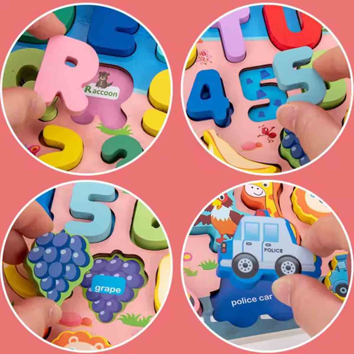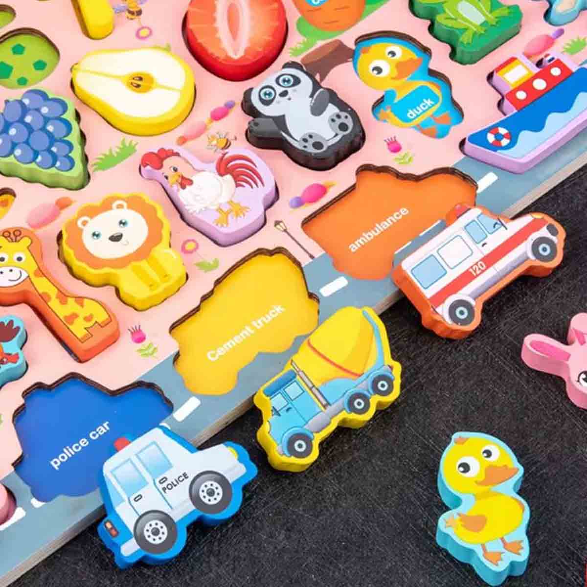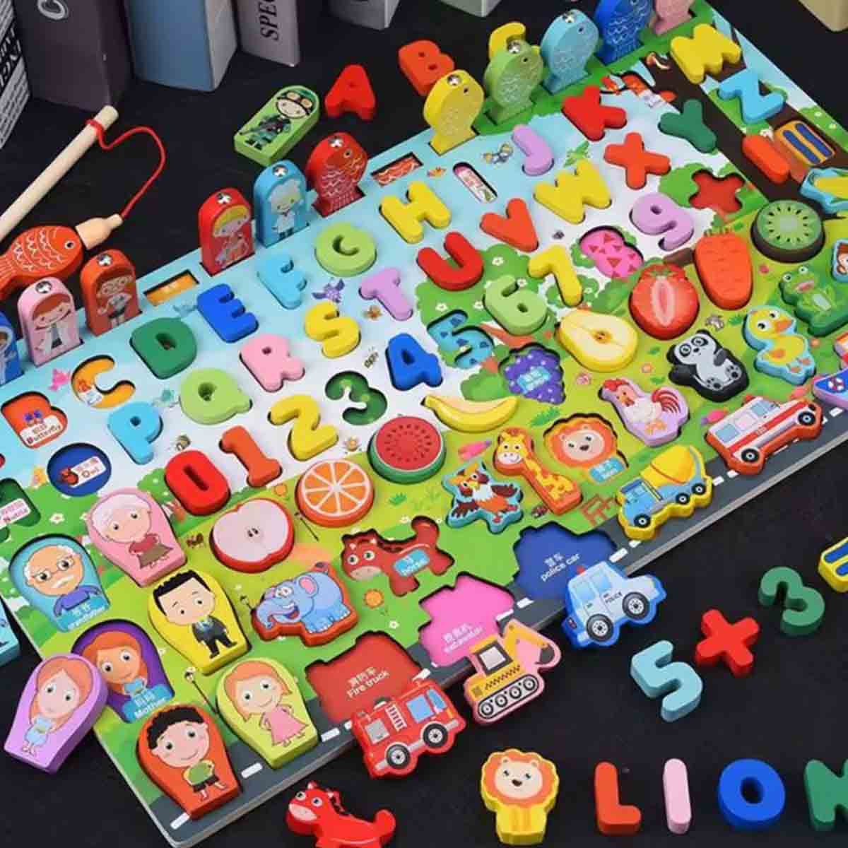 Turn playtime into learning time with this all-in-one  Wooden Educational Puzzle Board! Designed for toddlers and preschoolers, this colorful board combines multiple learning themes in one engaging toy: numbers, fruits,  professions, and even a magnetic fishing game.